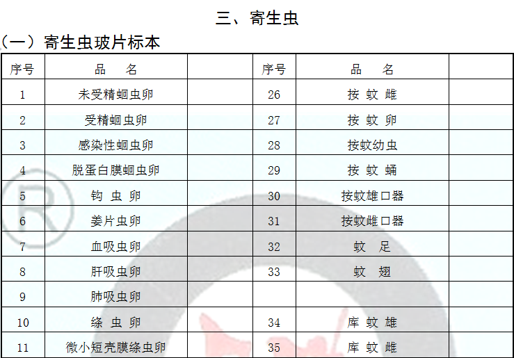2 按蚊針刺標本   27 血吸蟲浸制標本